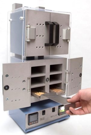 Термогравиметрический метод интуитивно – понятный. Сколько влаги испарилось из зерна при сушке, это и есть содержание влажности и точность стандартного метода определяется исключительно строгим следованием рекомендациям, прописанным в ГОСТ, и соответствием лабораторной техники и оборудования паспортным данным: для весов – погрешность взвешивания, для сушильного термошкафа – точность установки и поддержания температуры в камере.